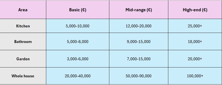 - Luxury bathroom: €18,000+ (walk-in shower, custom tiling, underfloor heating, spa-style design).